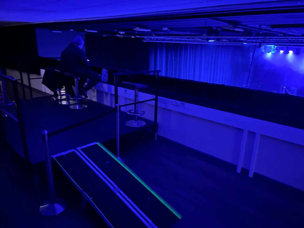 We were provided with bar stool placed on a platform which enabled us to watch the gig in relative comfort, however, if you have vertigo……. You can touch the ceiling from here, but so grateful to the venue for providing us with these facilities. Not convinced wheelchair bound attendees could see the stage.